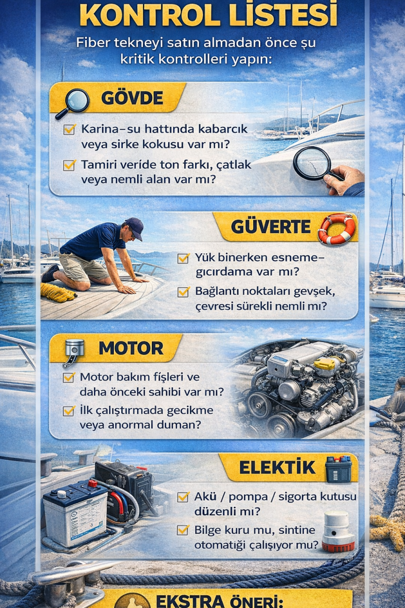 Fiber tekne satın almak, doğru kontrol yapılırsa harika bir yatırımdır. Bu rehberi bir “checklist” gibi kullanın; mümkünse bir ustayla veya ekspertizle hareket edin. Böylece hem güvenli hem de uzun ömürlü bir tekneye sahip olursunuz.