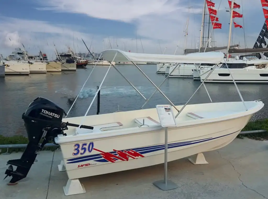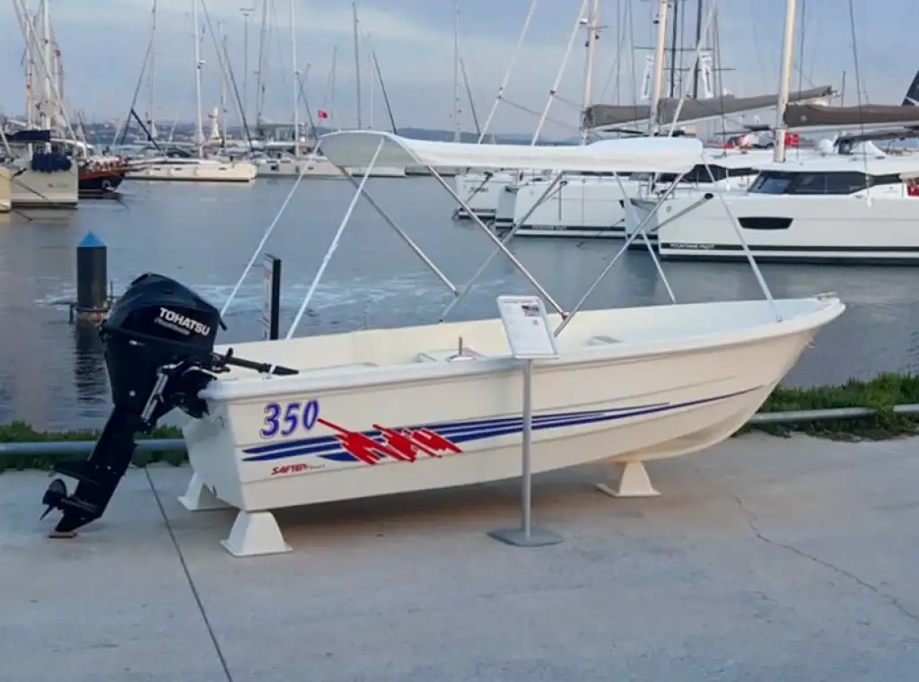 Safter 350 polyester tekne modelimiz hobi teknesi ve balıkçı teknesi olarak müşterilerimiz tarafından tercih edilmektedir. Kullanımı inanılmaz derecede kolay olan ve bir (1) adet livar, kapaklı saklama alanları, galvanizli dört (4) kg ağırlığındaki çapa eklentileri bulunan Safter 350 fiber tekne, hem balıkçılık hem de su sporları için mükemmel bir yapıya sahiptir. 350 cm boyunda, 140 cm genişliğinde; 99 kg ağırlığında, 25 cm drafta(su hattı yüksekliği) sahip 350 modelimiz denizde, sığ sularda güvenlidir. Ergonomik konsol düzeniyle zor deniz koşullarında Safter’in uzman kadrosunun üretmiş olduğu sağlam karinasıyla yumuşak ve pürüzsüz bir seyir sağlar. Safter 350 modelimiz kürek ve deniz motoru ile rahatlıkla kullanılabildiği gibi çevre dostu elektrikli dıştan takmalı motorlarla da güvenli bir şekilde kullanılabilir.